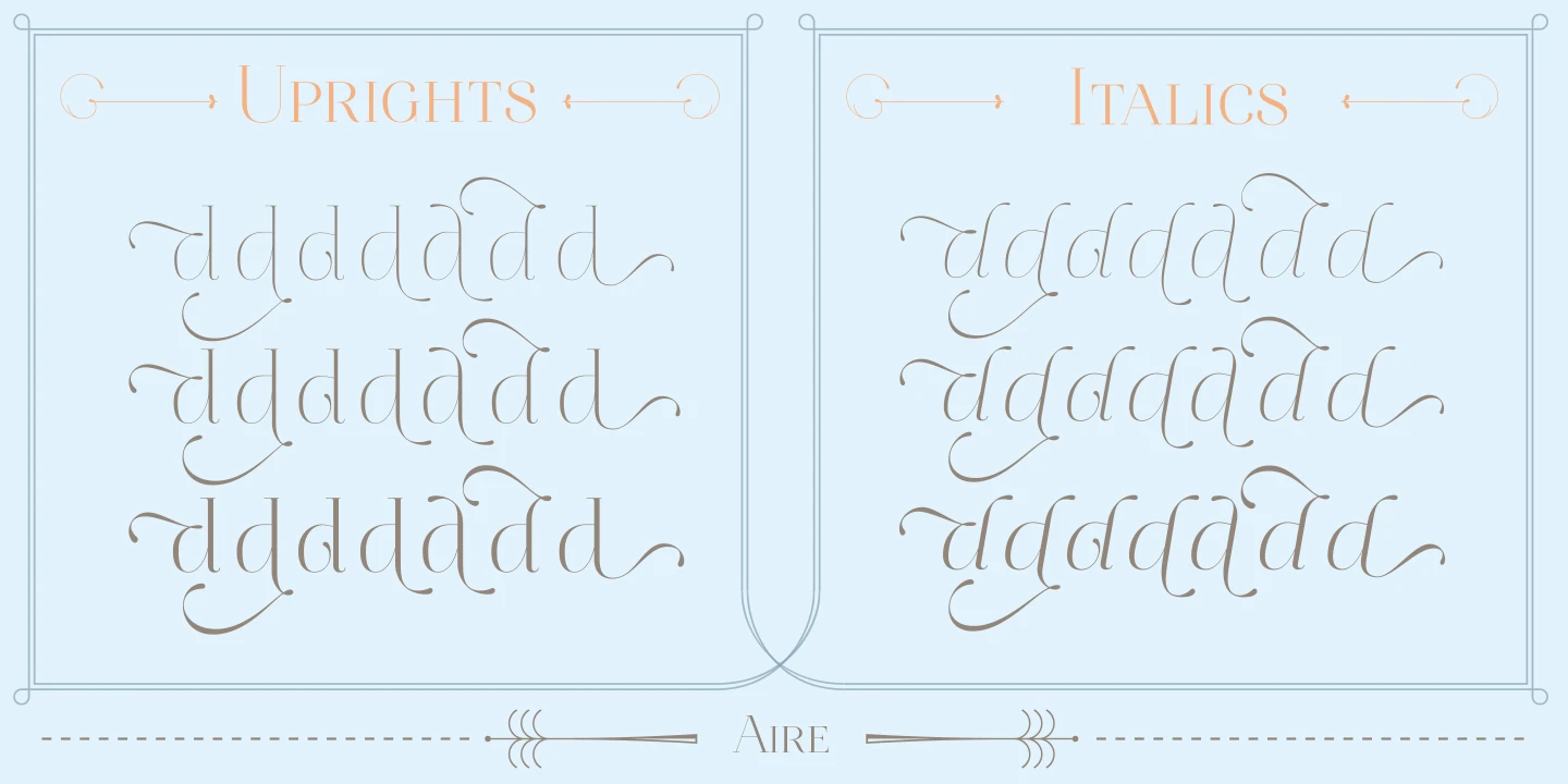 Aire is a delicately sophisticated serif family. It brings elegance and lightness, something softer, more fragile, and even a little playful to display typography. The slight contrast, sculptural curves, open shapes, and whimsical alternates give a graceful balance of refinement and flourish with enough personality to carry an entire composition. Whether for dazzling editorial headlines, a sparkling title sequence, or shimmering packaging — Aire is the right choice, par excellence!