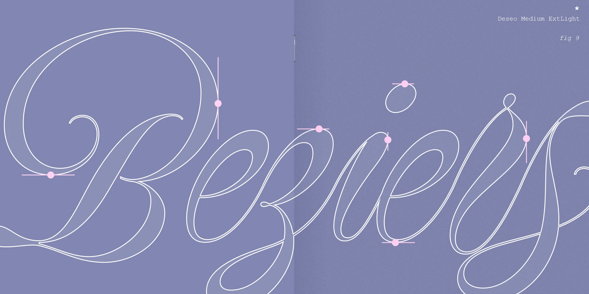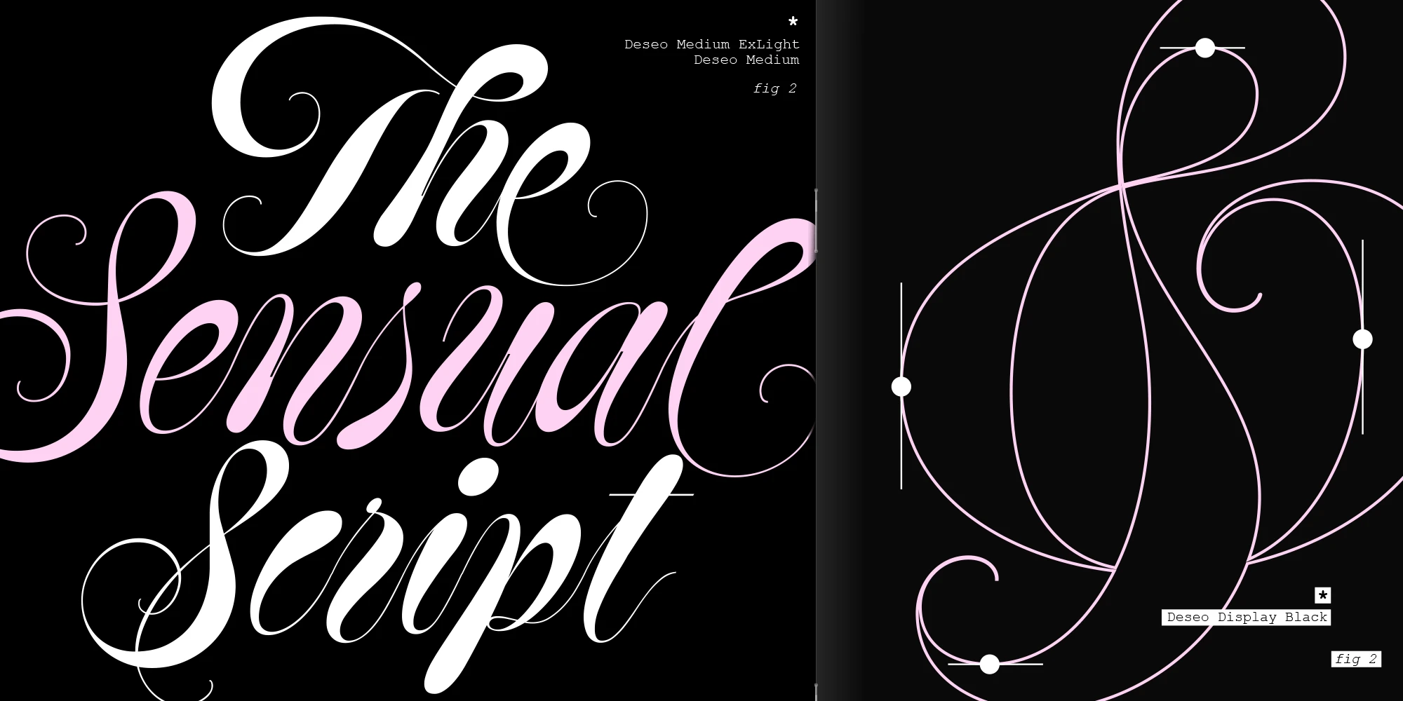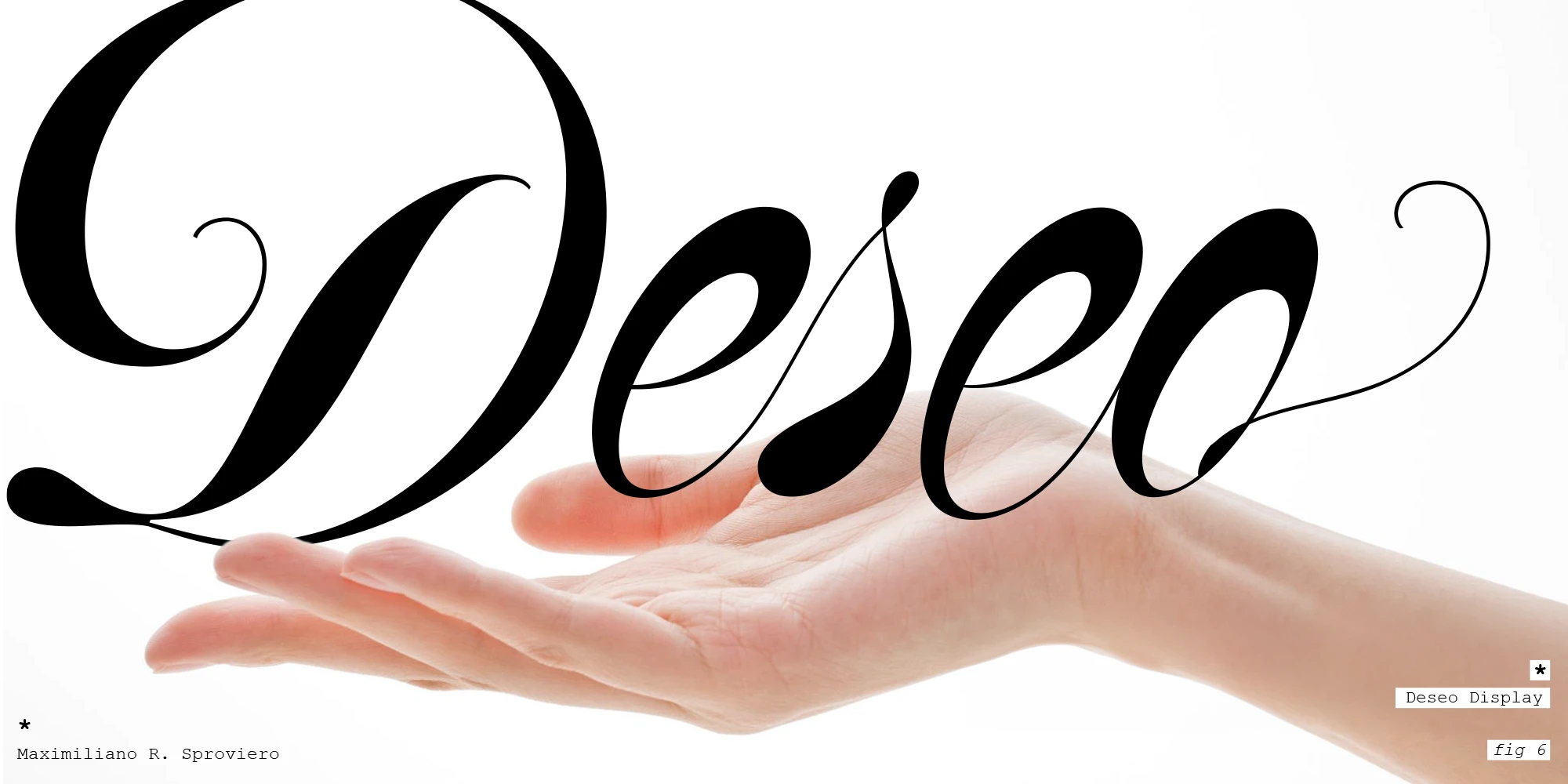 Deseo is an artfully exaggerated Spencerian script inspired by the 20th-century masters. Depending on context, it also pays homage to the nuances of the Italian Hand’s sophisticated elegance with its dynamically shifting strokes. Follow the sinuous contrast and curves. With several alternates for each character, plus additional ornamental flourishes, creating display typography that seduces and allures the reader will be no challenge. Deseo is a variable font with 3 axis: weight, size, and accolades.