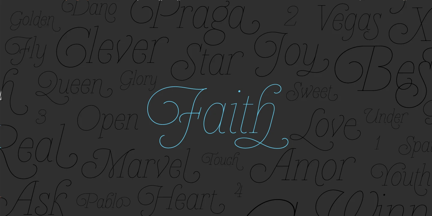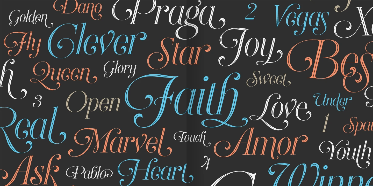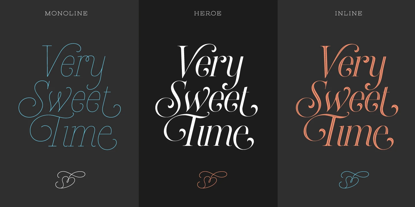 Heroe is a stylized italic full of surprising elegance and sharp visual drama. With delicate hairlines, unique ball terminals, and poetic curves, it takes some aspects of the classic Roman model and pushes them into expressive territory. The font family includes Regular, Monoline Big, Monoline Small, a striking Inline style, and Fleurons! Heroe is perfect for fashion magazines, perfume packaging, wedding invitations, or any luxury brand calling for sophistication with flair.