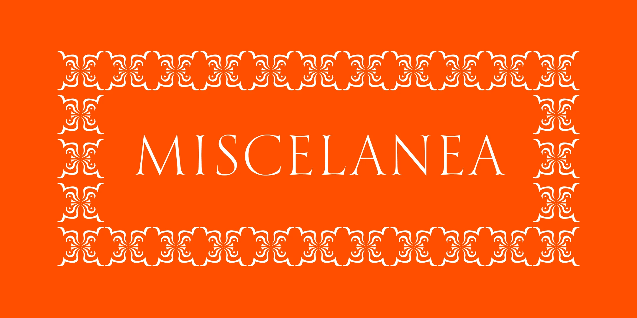 Miscelanea is an ornamental dingbat collection designed to catch the eye. Each glyph is a flourish of symmetry and movement — perfect for building patterns, creating borders to frame text, or adding decorative accents. Whether used individually or repeated to form striking motifs or backgrounds, these shapes bring rhythm and richness to packaging, posters, textiles, and editorial spreads. A playful yet polished way to dress up your design work.